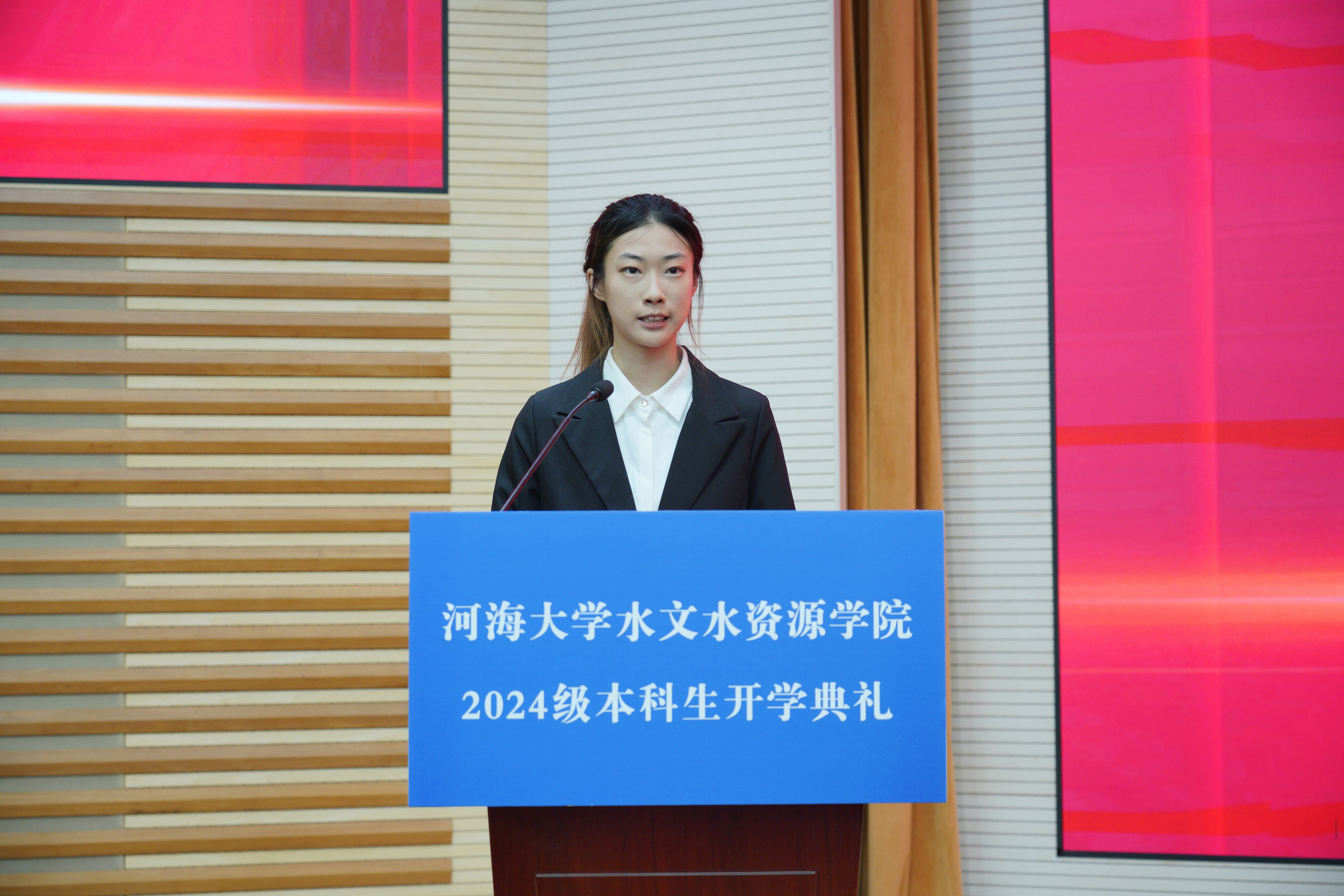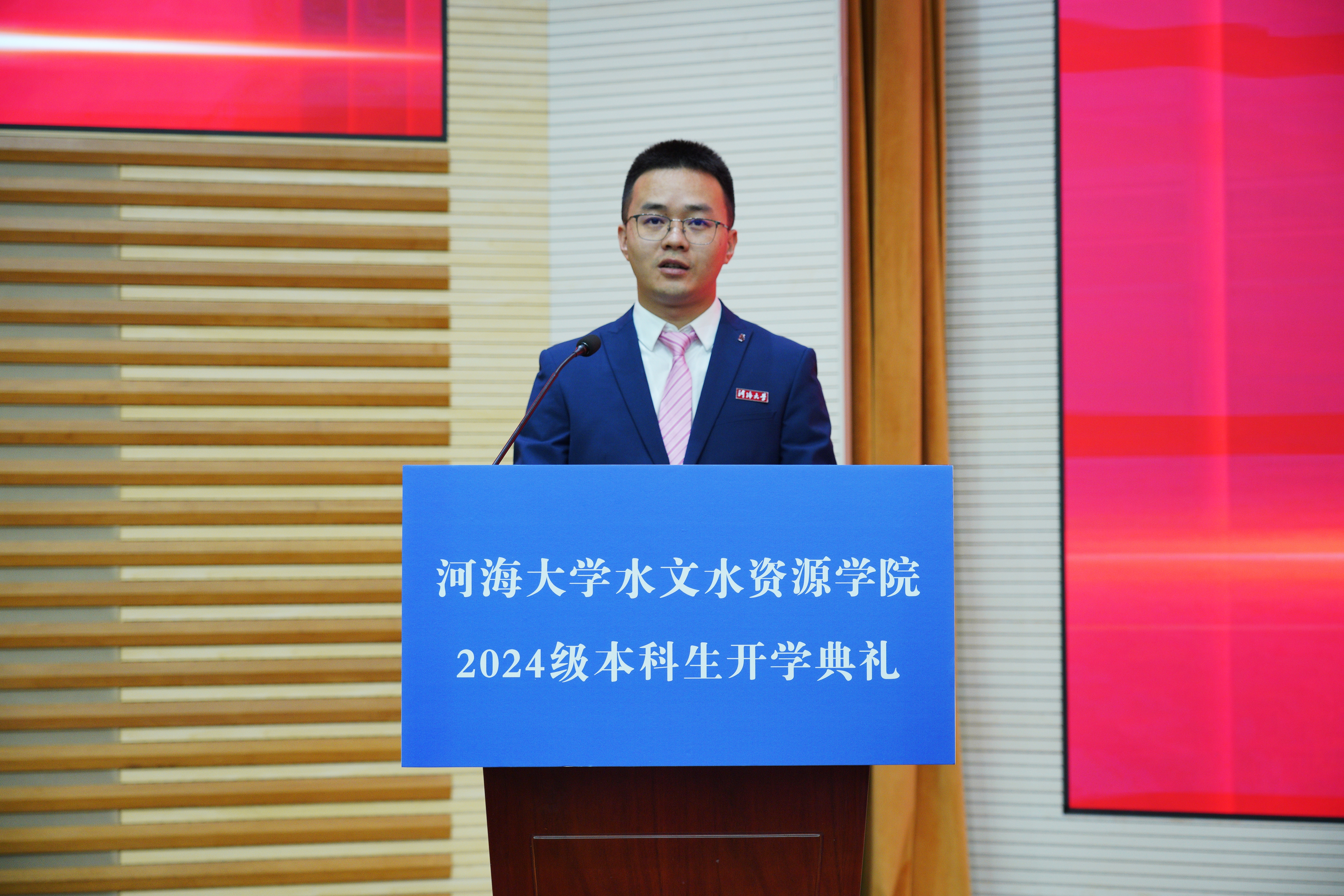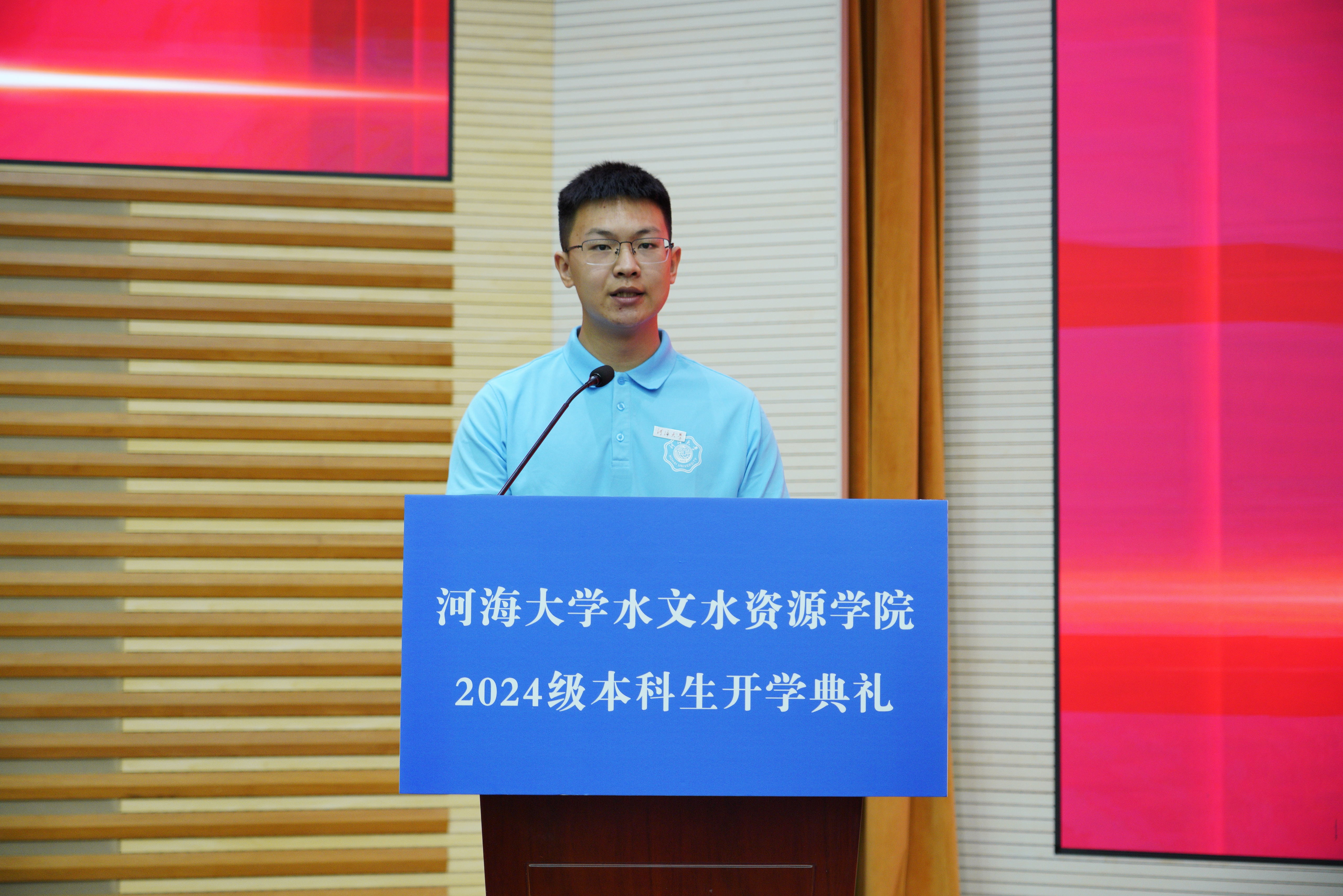 2024级本科生于学锦作为新生代表发言,表示将胸怀“国之大者”,不惧挑战,砥砺前行,担当起时代赋予的责任和使命,绽放属于新时代水文人的青春之花。
