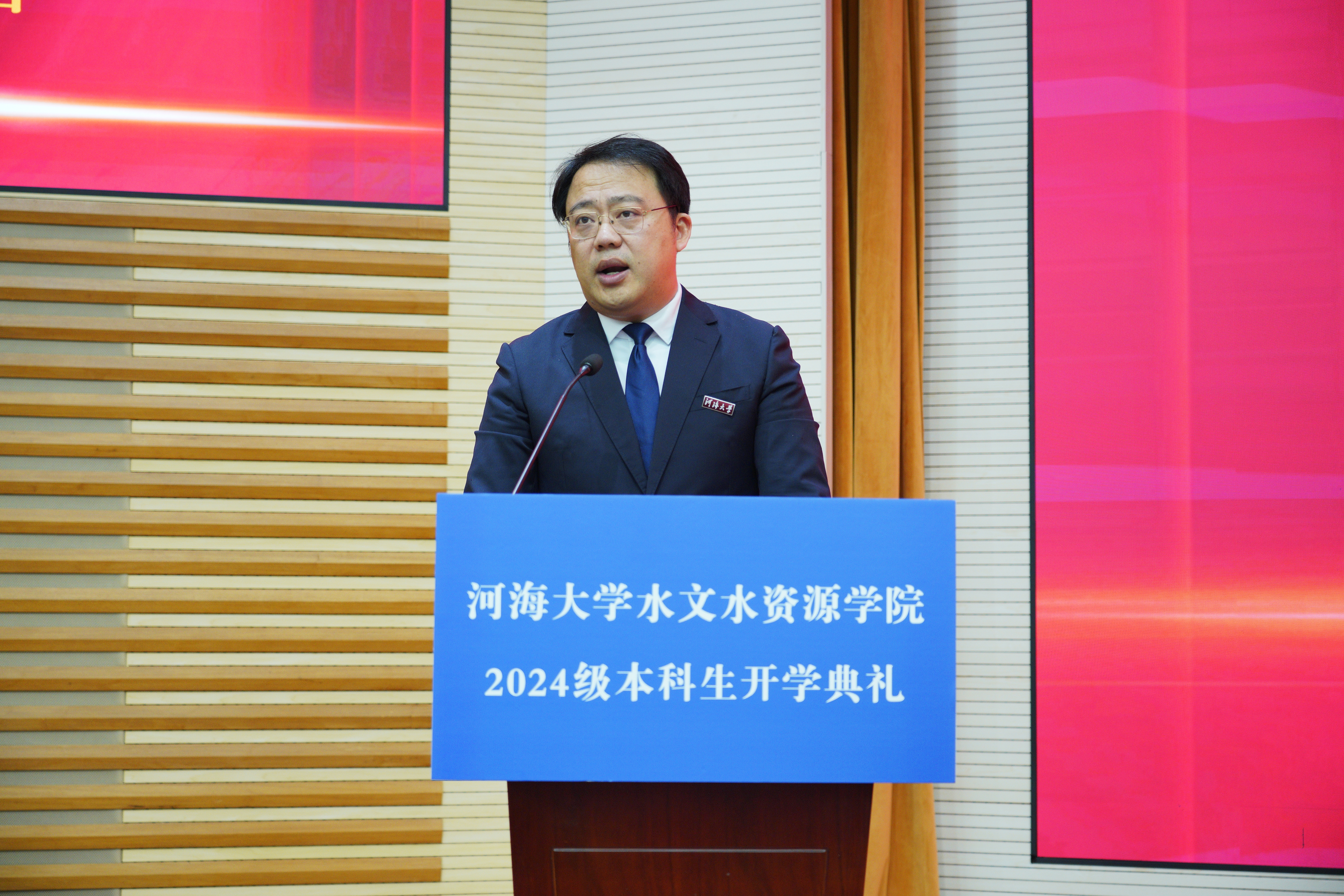 典礼在庄严的国歌声中拉开了序幕。鲁春辉院长代表全院师生对全体新同学的到来表示了热烈的欢迎和诚挚的祝贺,并发表了题为《勤而行之,日有所进》的讲话。他对全体本科新生提出三点期望和要求:一是做事先做人,立业先立德,要胸怀“国之大者”,树立国家为先、人民至上的价值取向,做个“大写的人”。二是做人要“有恒”,做事要“耐烦”,要沉得下心,以“自找苦吃”的精神向难而行、迎难而上,练就过硬本领。三是做人要“慎独”,做事要自律,要在主动探究中养成独立的人格,塑造更好的自己,并与同学们互敬互爱、互帮互助,共同成长。希望同学们赓续河海水文的精神血脉,继承发扬“忠诚、干净、担当,科学、求实、创新”的新时代水利精神,以奋斗姿态激扬青春,无负今日、不负时代。