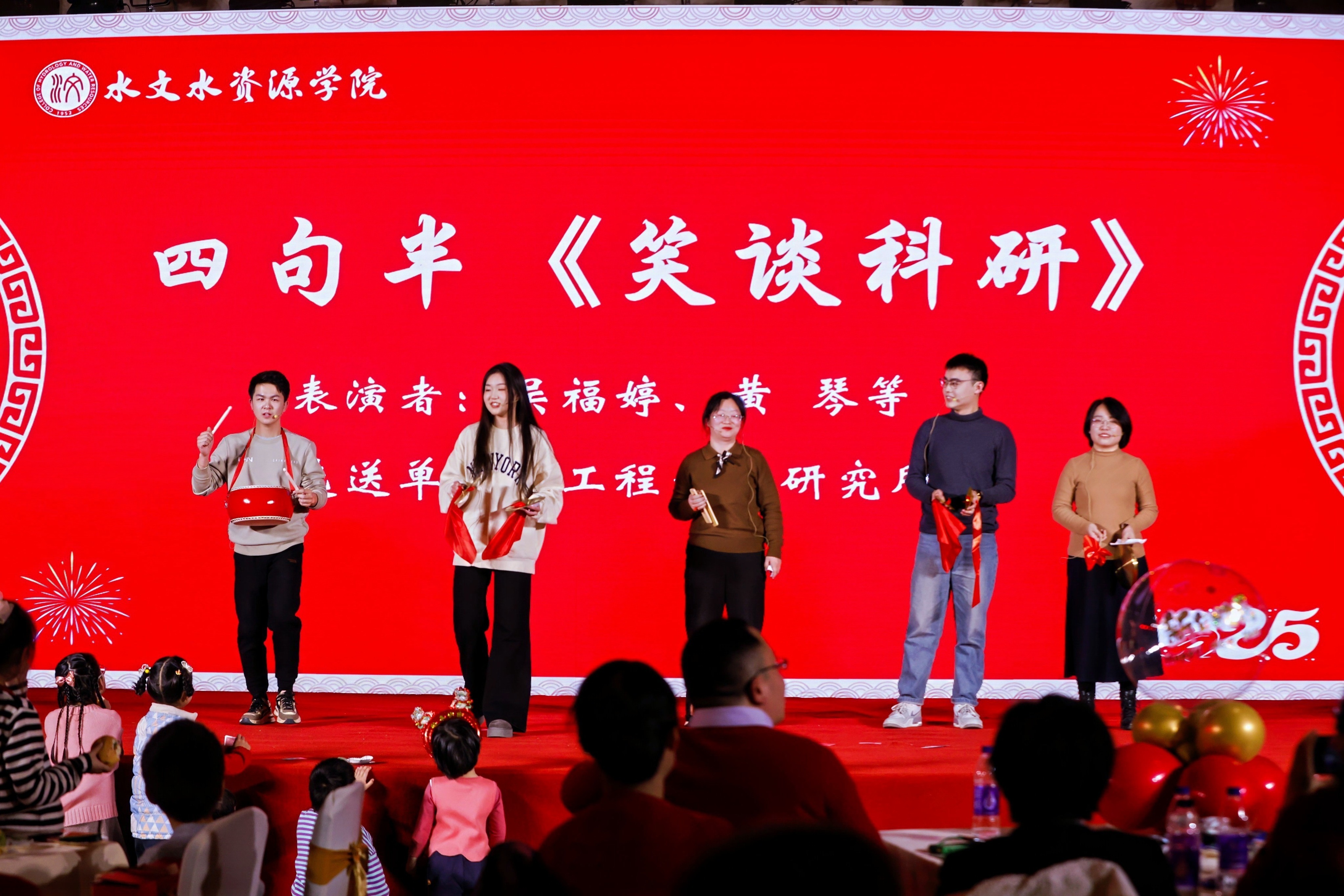 水文预报研究所老师带来的诗朗诵《我爱水文》,以幽默方式展现了对水文的热爱与追求;鲁春辉院长的魔术《瞒天过海》与现场观众深入互动,带来了一场视觉与心灵的双重震撼,赢得了观众的连连叫好;工程水文研究所师生的四句半节目《笑谈科研》,以轻松诙谐的方式讲述了科研趣事;生态水文所老师们演绎教师版《当》,传达了面对困难的坚韧与乐观精神;水资源研究所王文卓老师的舞蹈《故梦》婀娜多姿,飘逸灵动;韦语涵和王天越老师的琵琶、二胡合奏《欢乐斗地主》别出心裁,趣味十足;智慧水文研究所刘臻晨老师的《报菜名》贯口表演酣畅淋漓,致敬并传承了传统艺术。
