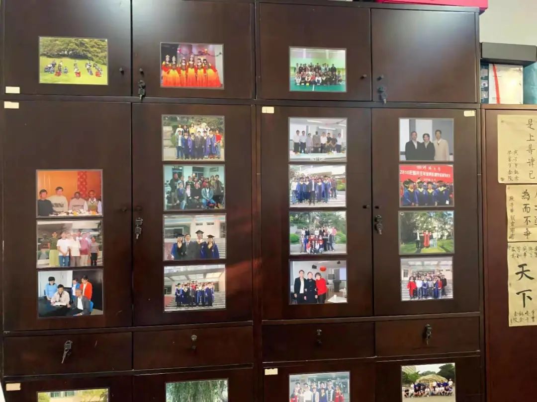 束老师办公室贴满了与学生的照片