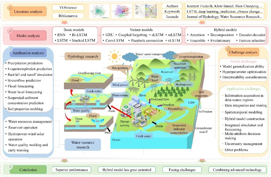 人工智能方法是水库调度领域的前沿热点。作为经典的人工智能方法,长短时记忆神经网络(LSTM)应用广泛,但鲜有文献全面综述LSTM在水文水资源领域的应用。为此,团队梳理了1500余篇水文水资源领域LSTM相关文献,辨识了LSTM关联模型发展历程,从预报模拟、水资源管理、水库调度、多能互补等视角出发,讨论了LSTM在水文水资源领域的研究成果,给出了LSTM模型泛化能力、可解释性等前沿挑战以及时空动态建模、多模型集成等前沿方向,以期为水库调度、水文预报等相关研究提供支撑。