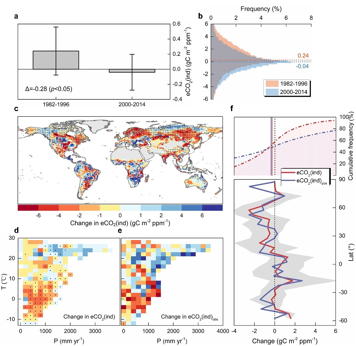 研究发现:大气CO2浓度升高引起的气候变化最初可以有效促进植被碳吸收的增长,但这一积极效应在近年来显著下降并在21世纪初转变为消极效应(即导致植被碳吸收的减弱),这种消极效应在未来仍将进一步加剧。CO2间接影响的减弱在北半球高纬度地区尤为明显,并同时伴随着CO2直接生理影响的减弱,可见当前由气候变暖和CO2施肥共同驱动的北方生态系统植被强劲增长态势将会减缓甚至是消失。广泛存在的土壤水分减少是上述CO2间接影响减弱的重要驱动力,除了在一些非湿润地区,干旱带来的水分利用效率增长反而可以缓解植被生长过程中的水分限制从而产生了相反的响应模式。本研究结果有助于更全面地了解全球变化对陆地生态系统的影响机制,以及该系统中碳-水循环间复杂的相互作用关系,从而为更加综合与务实气候缓和战略的制定提供有效参考。