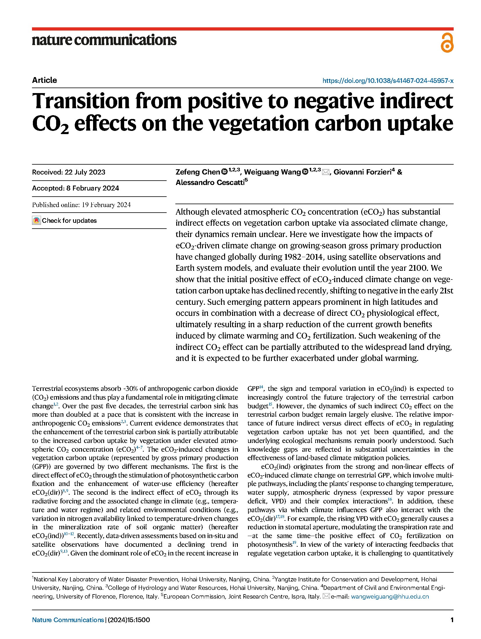 论文信息:Zefeng Chen, Weiguang Wang*, Giovanni Forzieri, & Alessandro Cescatti (2024). Transition from positive to negative indirect CO2 effects on the vegetation carbon uptake. Nature Communications, https://www.nature.com/articles/s41467-024-45957-x.