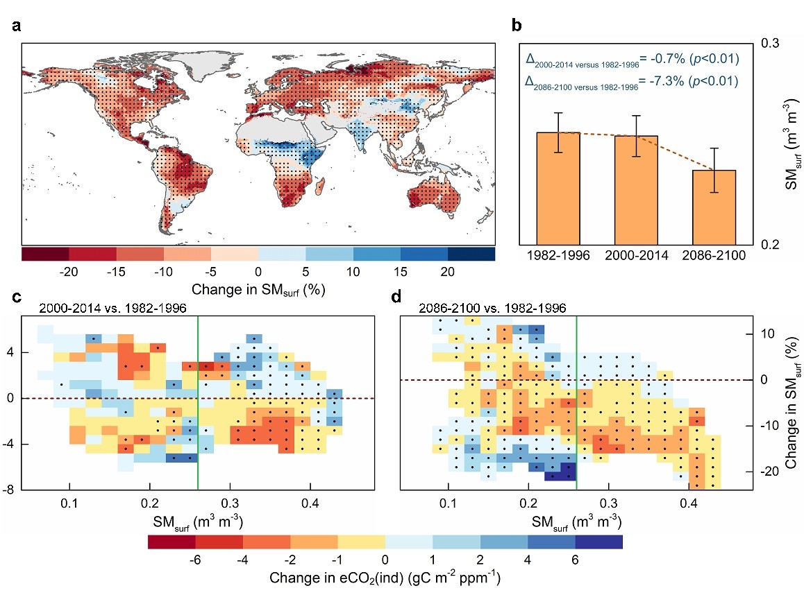 大气CO2浓度的升高显著地影响植被碳吸收,进而引起陆地碳收支情况的剧烈变化。除CO2直接生理影响(即CO2施肥效应)外,大气CO2浓度的升高也会改变气候条件(如温度、降水、水汽压差等)及其相关环境状况(如由温度驱动的土壤有机质矿化率变化及其带来的氮素有效性变化),从而间接地影响植被碳吸收。现有的研究表明,大气CO2浓度在近些年植被碳吸收增长中发挥着主导的作用,但CO2对植被碳吸收的直接积极影响在持续减弱也已是不争的事实。综合以上两点,CO2间接影响如何变化无疑决定了陆地碳收支的未来走向,即是否或何时会出现陆地碳汇向碳源的转变从而进一步加速气候变化。然而,这种CO2通过引起气候变化而对植被碳吸收施加的间接影响,其时间动态特征目前尚不明确且缺乏系统性的定量研究。此外,鉴于陆地碳循环与水循环间的高度耦合关系,水文条件的变化在其中究竟扮演着怎样的角色目前也没有清晰的认识。针对上述科学问题,我院王卫光教授团队同时利用遥感观测数据和地球系统模型控制试验结果在全球尺度上探究了CO2间接影响在过去三十多年间的演变规律(图1),并预估了在高排放情景SSP5-8.5下该影响的潜在变化趋势,最后进一步解析了土壤水分条件变化对CO2间接影响的内在调节机制(图2)。