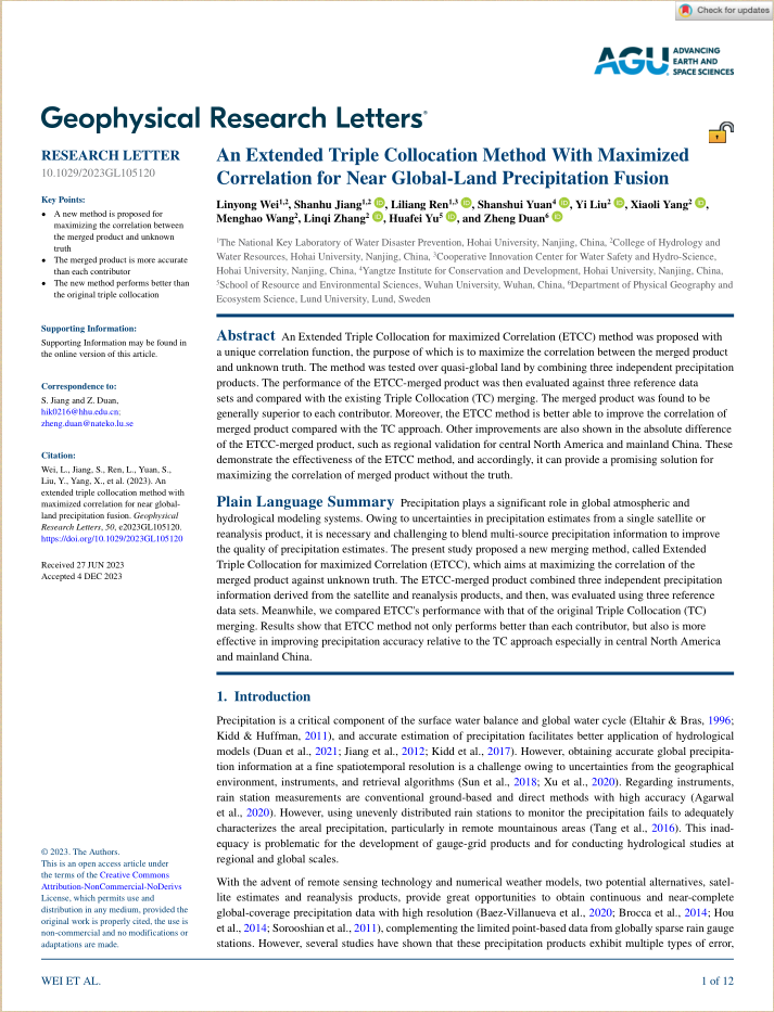 论文链接:Wei, L., Jiang, S., Ren, L., Yuan, S., Liu, Y., Yang, X., Wang, M., Zhang, L., Yu, H., Duan, Z., 2023. An Extended Triple Collocation Method With Maximized Correlation for Near Global-Land Precipitation Fusion. Geophysical Research Letters, 50, e2023GL105120. https://doi.org/10.1029/2023GL105120