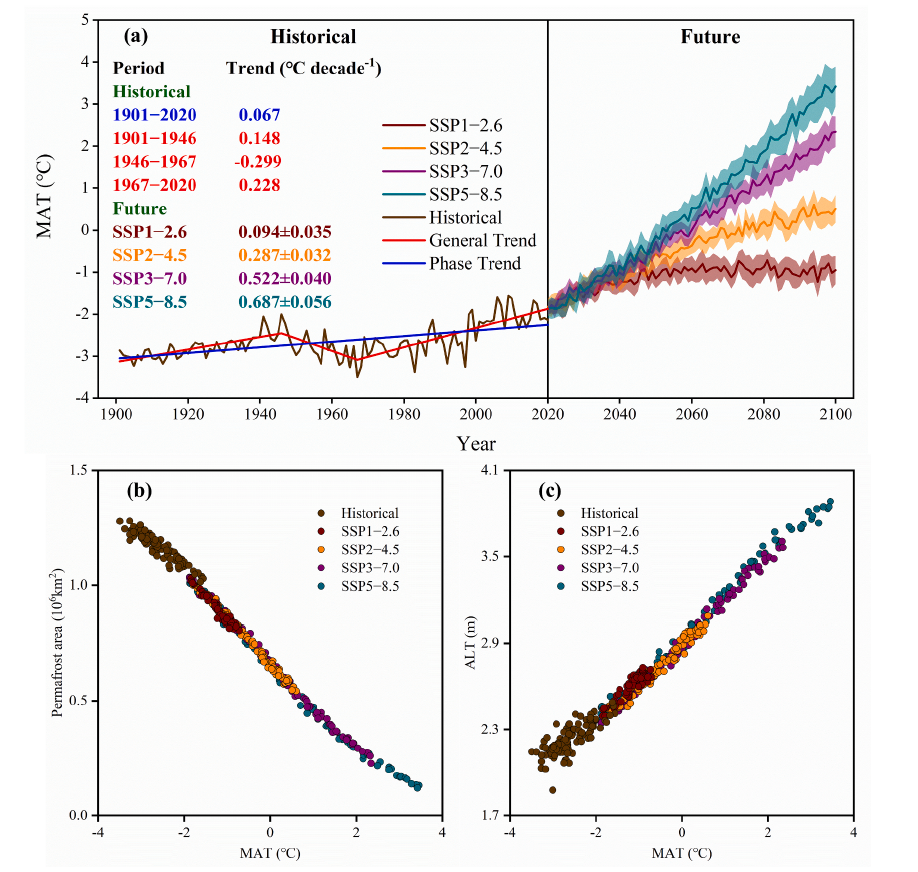 论文基于数据驱动方案,揭示了青藏高原1901−2100期间不同河源区的永久冻土演变规律(图2,图3),构建了长序列高时空分辨率的永久冻土面积、活动层厚度数据集,提高了气候变化影响下冻土要素的模拟精度,同时定量评估了青藏高原永久冻土区解冻的有机碳储量并分析了历史动态(图4),为青藏高原永久冻土区气候变化下的生态水文响应评价提供科学依据。论文链接:Shen, T., Jiang, P., Ju, Q., Chen, X., Lin, H., Zhao, J., Zhang, F., Yu, Z., 2023. Frozen carbon is gradually thawing: Assessing interannual dynamics of thawed soil organic carbon stocks in the Tibetan Plateau permafrost area from 1901−2020. Agricultural and Forest Meteorology 343, 109793. https://doi.org/10.1016/j.agrformet.2023.109793Shen, T., Jiang, P., Ju, Q., Zhao, J., Chen, X., Lin, H., Yang, B., Tan, C., Zhang, Y., Fu, X., Yu, Z., 2024. Permafrost on the Tibetan Plateau is degrading: Historical and projected trends. Journal of Hydrology 628, 130501. https://doi.org/10.1016/j.jhydrol.2023.130501
